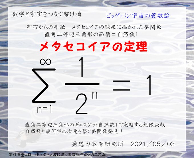 1次元の自然数1単位ベクトルと2次元の直角2等辺三角形の面積比の関係が等式で繋がれてメタセコイアの球果に描かれた数論と幾何学を繋ぐ関係が証明された。これは、数学と物理学が無限級数のメタセコイアの定理でつながったことを意味している。ピタゴラスの√2は次元を繋ぐ異次元自然数の比である