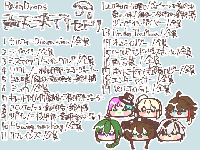 雨天決行セトリ☂︎*̣̩⋆̩* どの曲も最高だったしみんなかっこよかったし可愛かった…!!! 現地には行けなかったけどめっちゃ楽しかったよ…!!! おつかれさまでした!ありがとう!!!! #レイドロ雨天決行 #絵インドロップス
