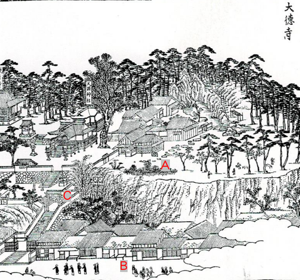 ラストに○○○たちがひそんでいた大徳寺。今は公園があります。長崎では「寺もないのに大徳寺」と、七不思議扱いだそうで。高いところから通りを見下ろすロケーションです。この図のA地点辺りに実在しない竹藪を生やしました。