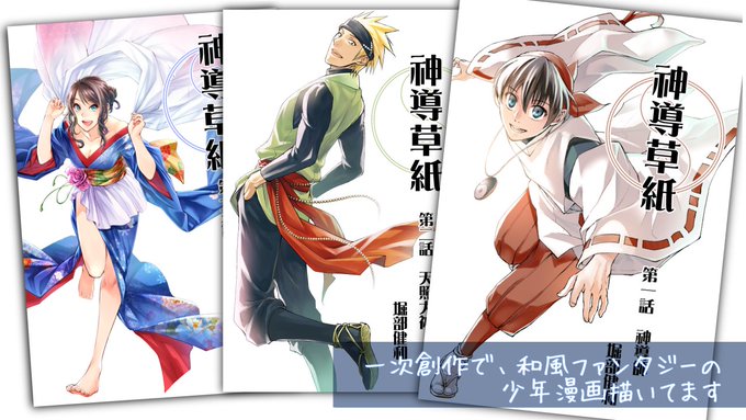 「神導草紙(しんどうぞうし)」という和風ファンタジーの少年漫画を描いてます。神を使役する主人公とそれを支える従者の二人の旅のお話です。
