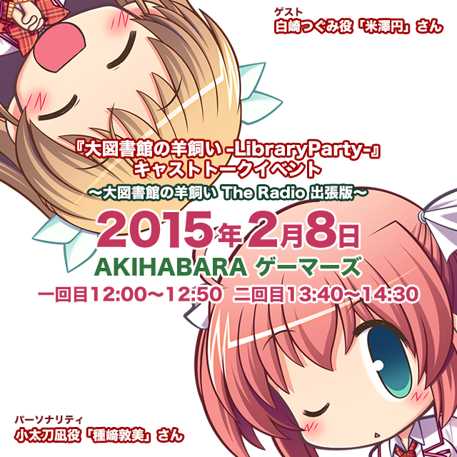 『大図書館の羊飼い-Library Party-』の発売を記念して2月8日、AKIHABARAゲーマーズ本店にて「大図書館の羊飼い The Radio」の出張イベントが開催されます。 http://t.co/MZHL9d8kXl