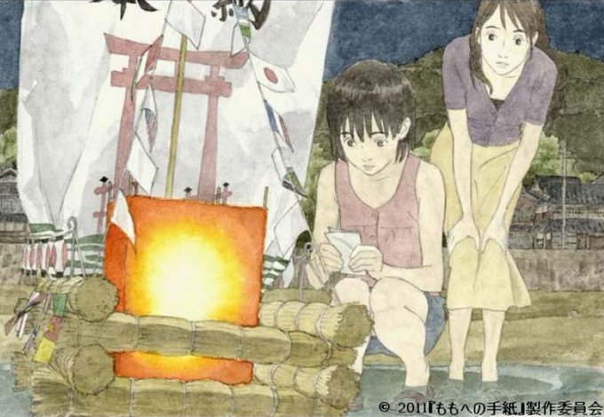 今治・桜井の綱敷天満宮で旧暦6/17夜に行われる「宮島さん」正式には厳島神社祭礼が『ももへの手紙』ラストシーンのモデル。祭りを迎えると家々は大きな提灯を灯し7歳までの男児の家族が手作りのわら舟を海に流す。ロケハンの時は祭りの2日前に台風が四国を縦断し、嵐→祭と映画の状況をガチで体験😅