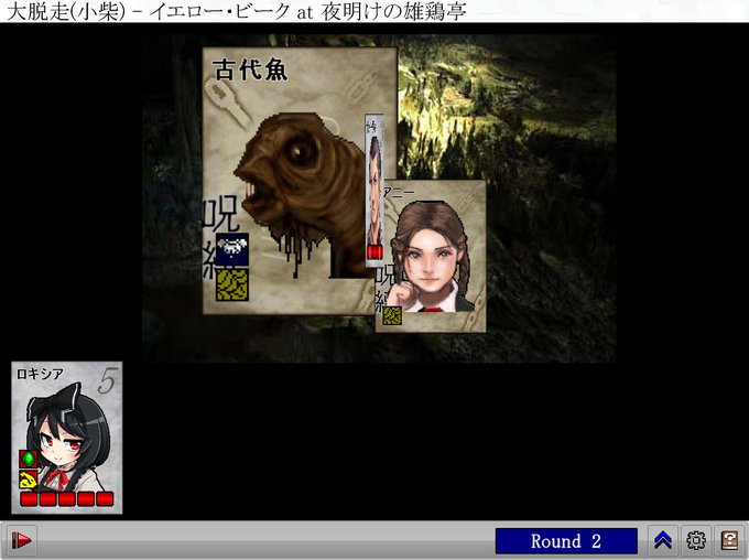 古代魚戦。同行者を捕縛しているため全体攻撃は控えよう…と言っても相手は一匹。余程のガバがなければ問題無く倒せるはず。セイレーンより体力は多いが【魔力属性】に弱いので魔法の矢があれば有利に戦える。激流飛沫を食らわせてNPCと共にボコって終了。2枚目はあっけなさ過ぎて撮影をガバった図。
