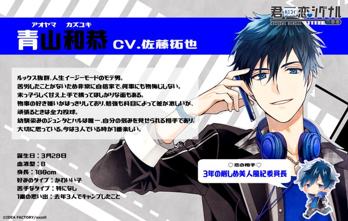 【君恋シグナル】詳しくキャラ紹介!:青山和恭(CV.佐藤拓也)「恋人はできるもんじゃなくて、作るもんなの!そこを勘違いしてっから、お前らいつまで経ってもアレなんだよ」モテ男なカズがどんな恋をしたのか…!本気のカレをお見逃しなく! https://t.co/BKgtqx2HTW #オトレコ #君恋シグナル