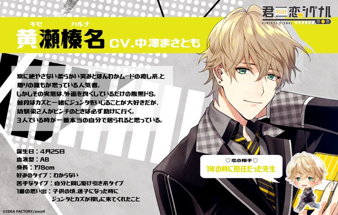 【君恋シグナル】詳しくキャラ紹介!:黄瀬榛名(CV.中澤まさとも)「俺は、恋よりジュンちゃんとカズくんと遊んでるほうが楽しいかなあ。だって、恋人ってあんまりいじめちゃいけないんでしょう?」省エネなハルの変化と恋に是非ご注目ください! https://t.co/BKgtqx2HTW #オトレコ #君恋シグナル