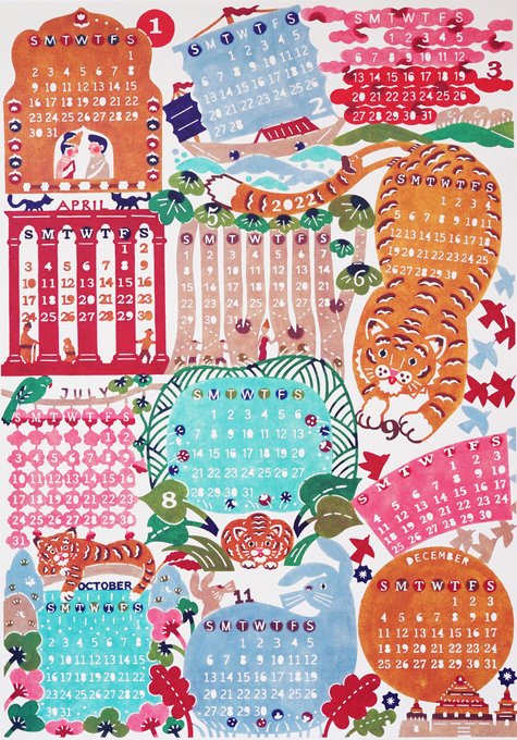 kata kataさんの2022年のカレンダーは「とらのはじまり」と題したカンボジアの昔話に準えて、物語の場面がカタカタさんの独特なタッチと型染めによるふんわりとした色彩で展開されています。