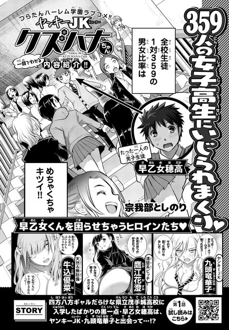 本日木曜日(3/19)発売「#週刊少年チャンピオン」16号より #宗我部としのり 先生の新連載「#ヤンキーJKクズハナちゃん」スタートです!<内容紹介>359人のJKにいじられまくりなつらたんハーレム学園ラブコメ!ギャルだらけの高校に入学した黒一点・早乙女君は、ヤンキーJK・華子ちゃんと出会って…!?