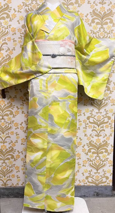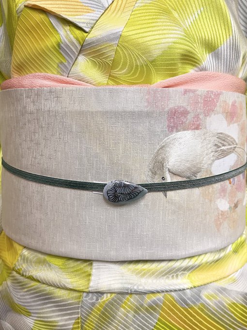 #今日のトルソーさん は、黄緑色の暈し模様のお着物に、鳥さんの刺繍が施された名古屋帯を合わせた春らしいコーディネート👘🕊帯留めは @ue_kimito さんの七宝焼です💠