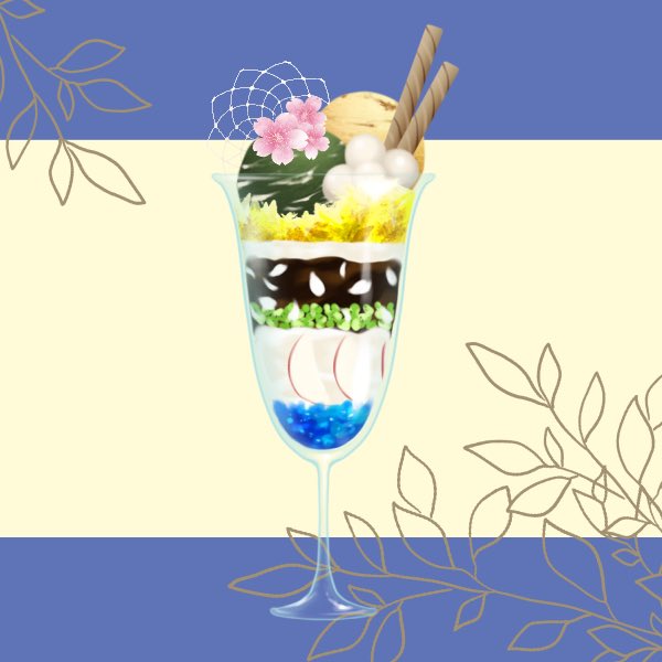 便乗して花宵和歌のイメージパフェ。和風っぽく抹茶ときなこのアイスのイメージ。あとロッカーのシールモチーフで。一番下はさわやかなゼリーで締め。