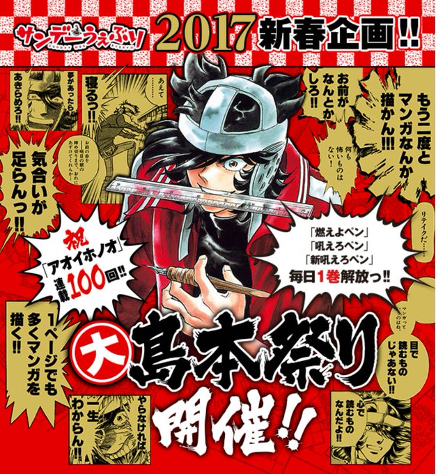 ★1/9★『アオイホノオ』連載100回記念!!!新春企画!!!大∗島本祭り!!本日は『吼えろペン』⑧巻を大公開!!!2017年は島本作品で燃えろ、吼えろ(*ノ゚Д゚)八(*゚Д゚*)八(゚Д゚*)ノ! https://t.co/hSlqTyNEnU