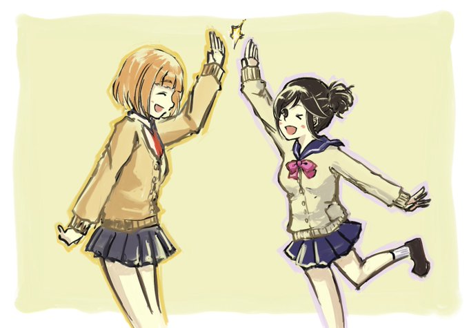 前イベでフリスクではハイタッチがお約束と明かされましたが、特に柚とあずきは出会う度にしてそうです。身長差を考えるとこんなカンジでしょうか。尊い。