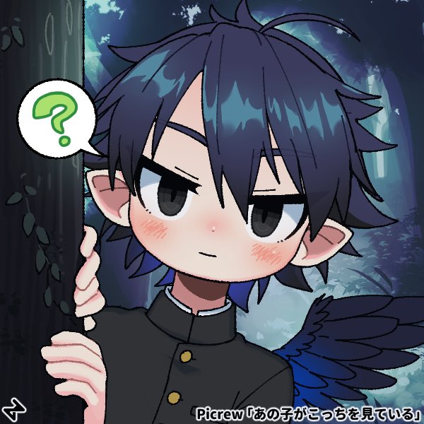 #あの子がこっちを見ている をお借りしてうちの子を作ってみた。紗紺くん。釣り人くん。烏天狗くん。お供さん。みんな描き分け出来るか不安な髪暗い系の子たち