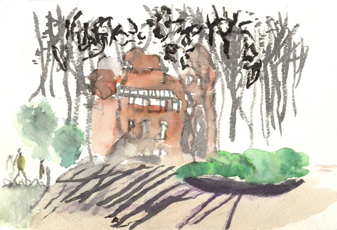 左側に人が、木々に包まれるように建物が描かれています。
