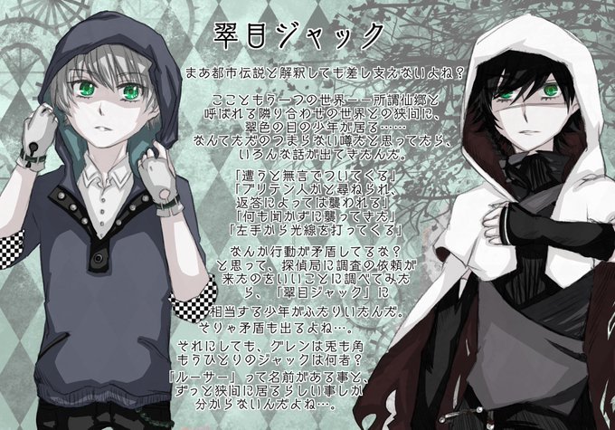 オリジナルの都市伝説です。【狭間】に紛れ込んだ人を襲う翠目の少年。比較的穏やかな時と、や誰彼構わず襲うおっかない時との差が激しい。どういうこと?」と探偵局が捜査した結果、2人いたことが判明。前者がグレン、後者がルーサーくん。きょブロにおける翠目は要注意人物です。