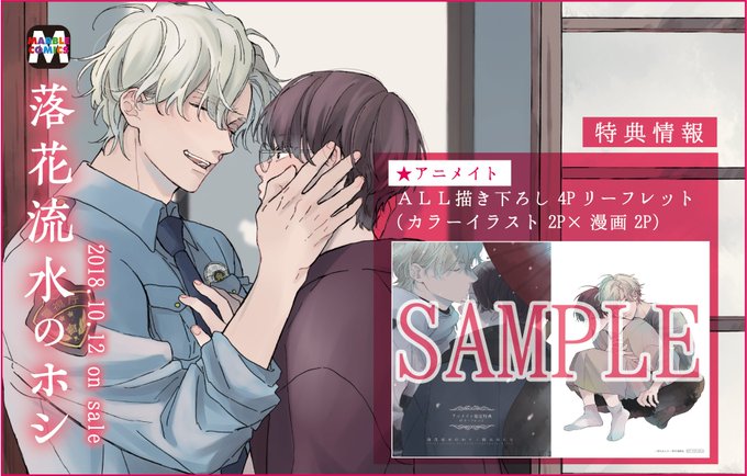 【新刊特典情報】10/12発売、鈴丸みんた先生『落花流水のホシ』(東京漫画社)には、アニメイト限定ALL描き下ろしの4Pリーフレットがついてきます。 早期売り切れが予想されますので、欲しい方は早めにゲットしてくださいね! #アニ推しBL