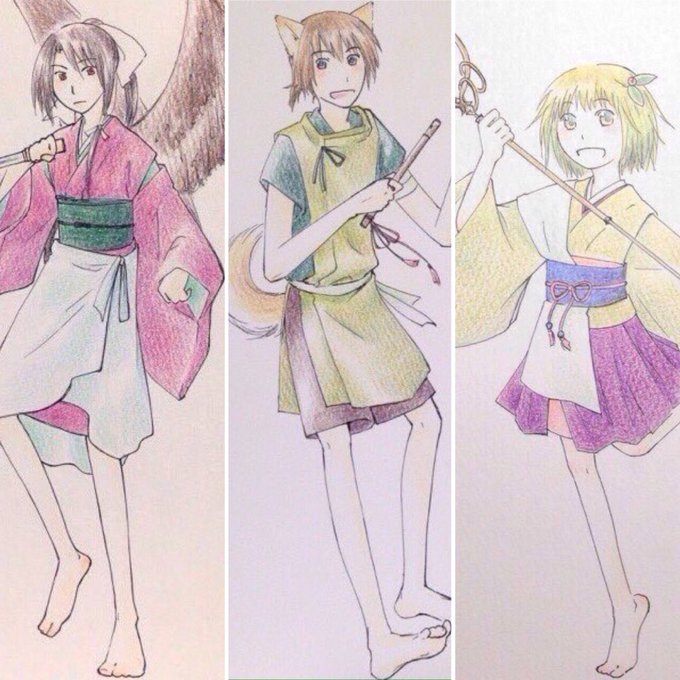 鷹娘〈隼はや〉と犬少年〈風牙ふうが〉と植物幼女〈小花こはな〉(画面の都合でほんとはもっと小さいです)