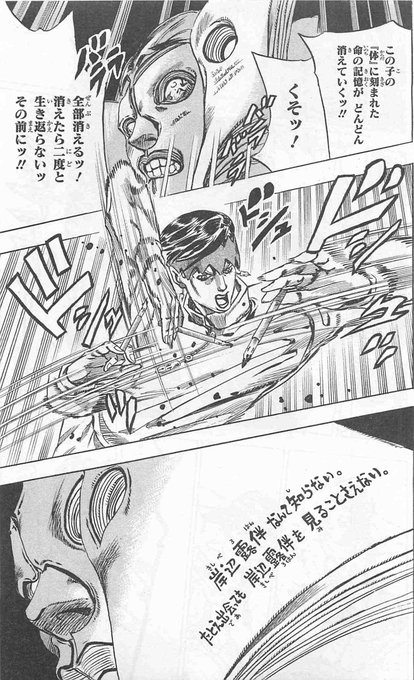 静ジョを書き始めた頃はね、露伴先生人とか動物にしか能力使えなかったんだよ 知能がある動物になら能力使えるとか、死んだらページの文字消えていくとか言いながら死んだチキンに能力使うんだから、本当荒木先生いい加減にしてほしい(褒め言葉)