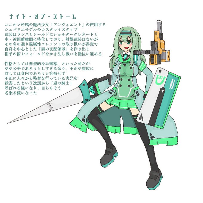 ナイト・オブ・ストーム:ユニオンの魔法少女「アンヴィエント」の仕様するシュバリエモデルのカスタマイズタイプ、ランス・シールド・グレネードといったシンプルな中・近距離戦型。「風の支配領域」により相手をかき乱し優位に戦う。 #魔法少女規格