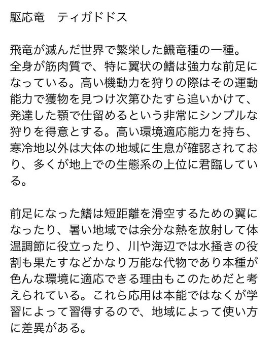 多くの竜が滅び、生き残った種が繁栄した未来のモンハン世界で生きる魚竜種から進化したモンスター。絶滅した飛竜ティガレックスのニッチに入り込んでいる。