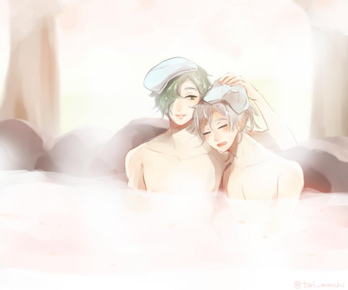 #鶴丸受け版深夜のお絵描き60分一本勝負 お題/お風呂(温泉)、桜。 鶯鶴です。