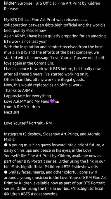 IG - @kildren12 shared his beautiful #RM version of the 'BTS Official Fine Art Print' from his new collab with BigHit and @sideshow via Instagram.