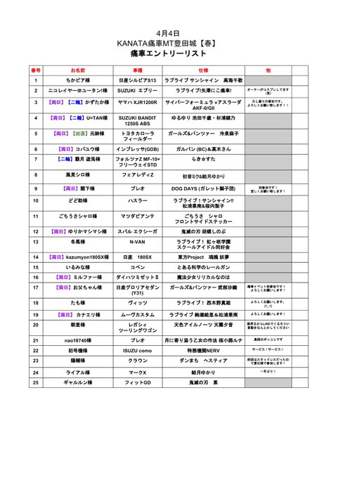 現時点で20台超えました♪まだまだ痛車エントリーお待ちしております。