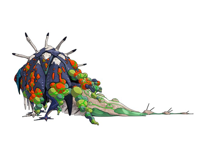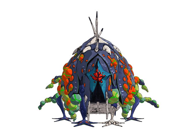 A unique type approximately 3 metres tall. While camouflaging itself by emitting a mist from the ventilation holes on its body, it attacks with its huge jaw and sharp claws, which are webbed.