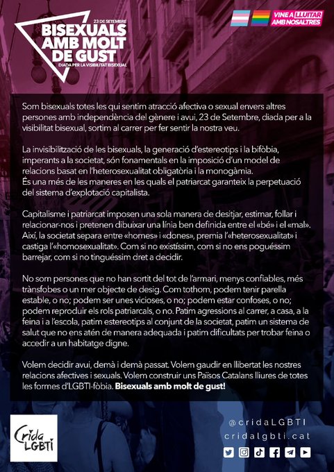 ✊ No som persones que no han sortit del tot de l'armari, menys confiables, més transfobes o un mer objecte de desig. Som bisexuals amb molt de gust!