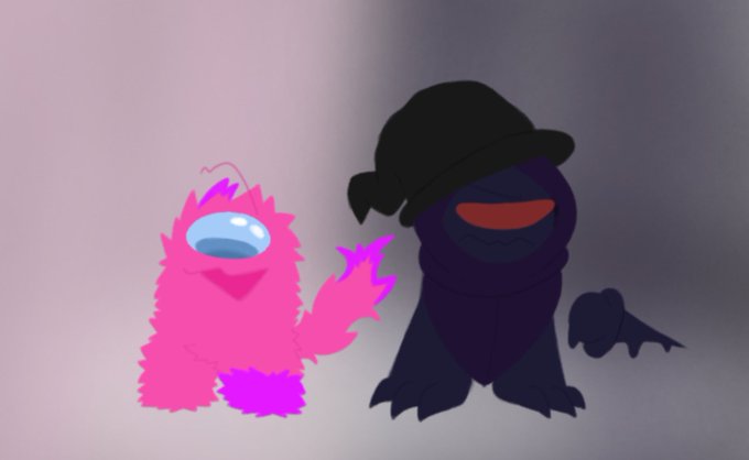 1) my ocs 3Q and Gaël (who is a werewolf) a T4T gay couple and Wine Bourbon in the backroung (they are a vampire enby)