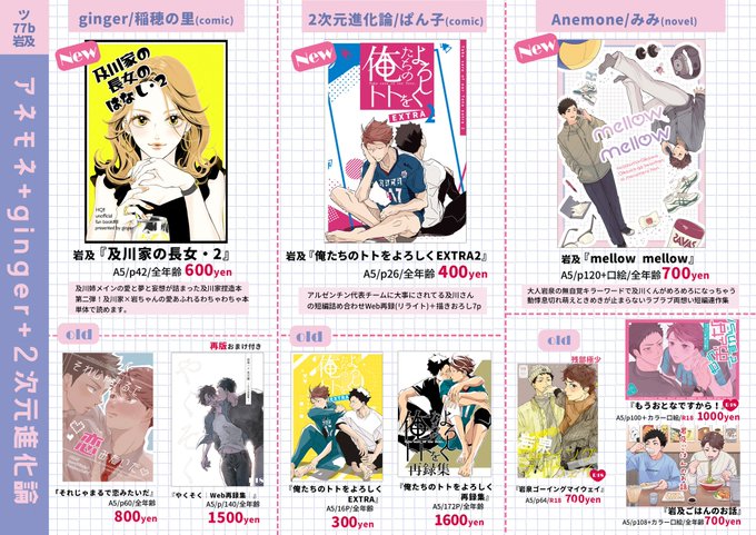 6号館Dツ77b 岩及『アネモネ+ginger+2次元進化論』おしながきです。ぱん子@2jigen_shinaron ,