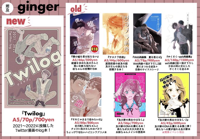 東4タ25a/Anemone+タ25b/ginger 稲穂の里@inaho_no_satoさんと隣接で参加します。岩及sp🩷ぱん子@2jigen_shinaronさんの本も委託!夏インテ新刊を初頒布&コピー本新刊あります。売り子私だけです。
