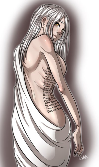 My #cleric Wyndolin has lost a lot of friends and loved ones. For each one she loses, she gets the name tattooed on her skin. She's a sad character, but tries her best to be hopeful and helpful. #dnd #dnd5e #dndcharacter #aasimar #artistsontwitter