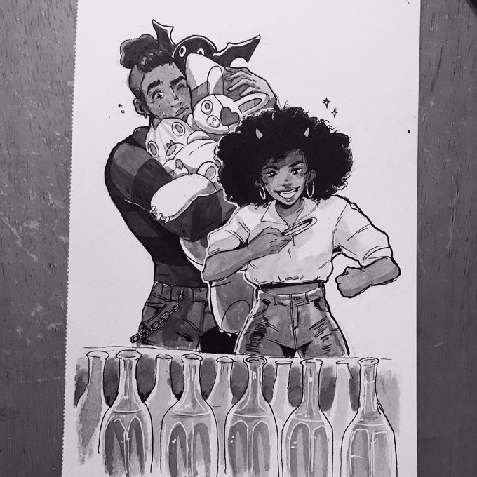 inktober day 1 complete! 🙏🏾 i experimented with a dip pen and ink for the first time so its super messy and uggo but i hope to get better n better as the month progresses. these are my two ocs shiloh and robbie on a cute halloween carnival date... #inktober #Inktober2019 #ring