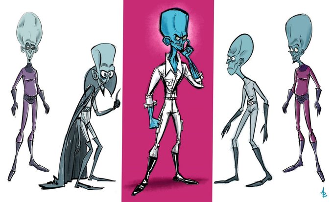 Concept art from MEGAMIND (Tom McGrath, 2010) featuring early designs of Megamind (Will Ferrell), Minion (David Cross), Roxanne Ritchi (Tina Fey), and Hal "Tighten" Stewart (Jonah Hill). #Animation #ConceptArt #Megamind #FilmTwitter