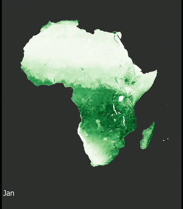 An impressive visualization of the vegetation intensity variations in Africa during a solar year https://t.co/ehTi7zft3J [more info about the Normalized Difference Vegetation Index (NDVI) https://t.co/mtgmvXZS8m] [data source: https://t.co/RyV1eBI9WM]