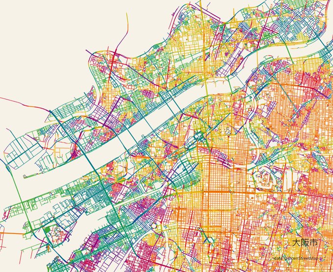 ①中心部は近世の大坂城下に形成された碁盤目状の街路。②北部~西部は淀川やその派流に影響された向きの街路。③南部は(上町断層に沿った?)街道や鉄道を軸とする斜め向きの古い市街地と、その間を埋めるように広がった後発の市街地。