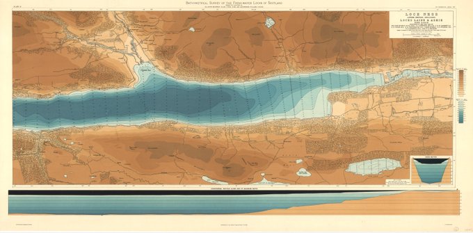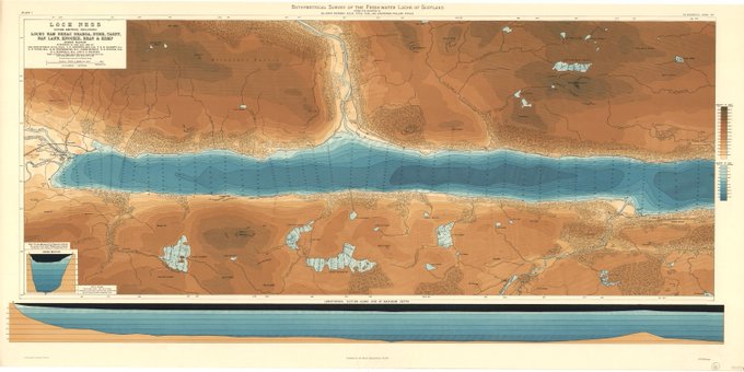 In honor of the #LochNessMonster, here's a 2-piece, 6.5-ft-long bathymetric map of Loch Ness published by @RGS_IBG in 1908. See 100's more bathy maps of Scotland's lochs at https://t.co/JIpL1FC9W4. (Loch Ness is only the second deepest.) #cartography #maps