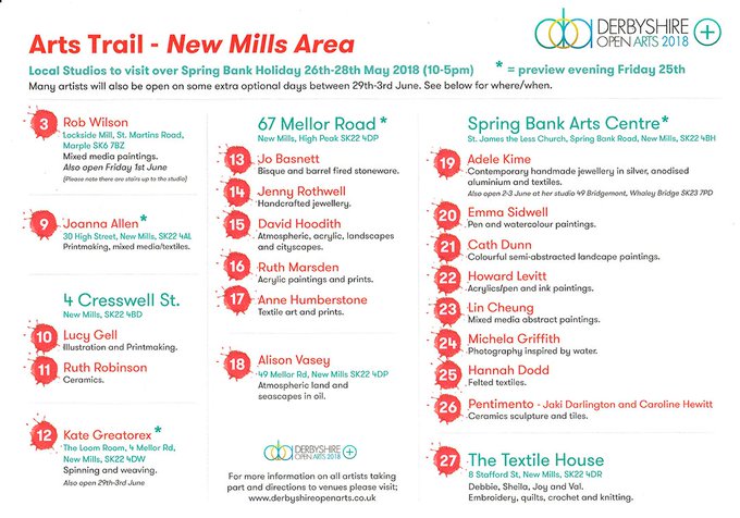 Collected my @DerbyshireOArts #NewMills maps today & don’t they look good; thx Paul Gent & Rob Wilson. 23 Artists at 8 Venues–what’s not to like? Hope to see you @SpringBankArts Look out for our flyers too & start planning your #arttrail w/e #DOArtsSpringBankNewMills18 #DOartsPDA
