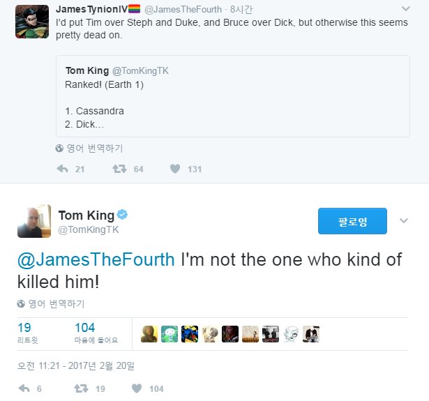 4) 이에 대해 <디텍티브 코믹스>의 작가 제임스 타이니온은 나름대로의 랭킹을 제기했는데요. 이에 대해 톰 킹은 제가 팀 안 죽였(?)어요!!!로 반응했습니다.