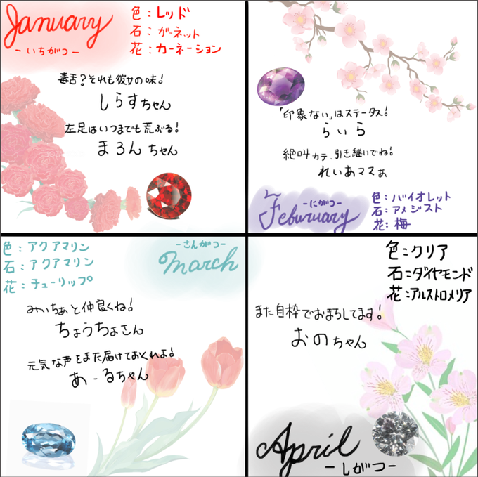 名前だけだともったいないなあと思ったので誕生月の色・花・宝石を書いてみたり一言やらなんやら添えておきましたwwwwww