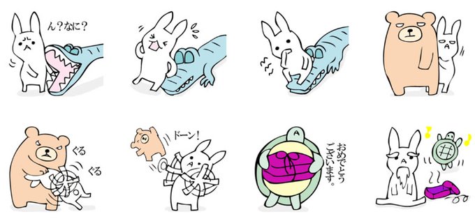 自由きままなおとぎ話のうさぎです。熊と鰐とカメとトラと龍などの仲間たちと仲良くしているスタンプです。