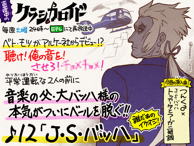 今夜24時からはEテレで #クラシカロイド 第12話(再)! ベトとモツがプロデビュー!? プロ、すなわち大人の社会。2人は適応できるはずもなく! 助けてナゾのスパダリ風イケオジ! 今夜はサタデーナイトフィーバー! 牛乳を口に含みながら見ると危ないぞ。ドンミスイッ!