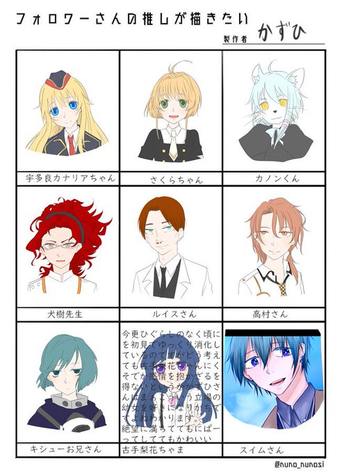 枠いっぱいに描くみたいな風潮には乗れませんでした!!似てないのから似ていないのまでありますが、楽しかったです('ω')ノ遊んでくれたフォロワーさんありがとうございました!