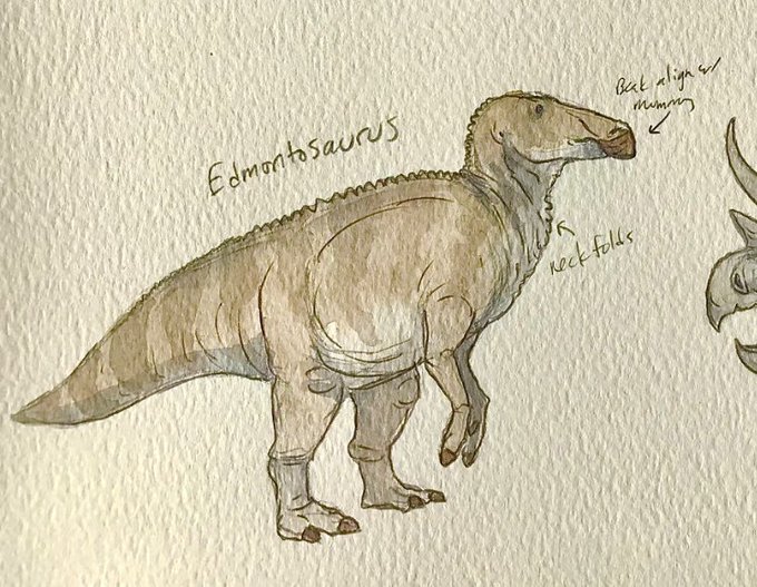 Here’s my #Edmontosaurus in #watercolors at the new #Dinosphere exhibit at the @TCMIndy and the first concept sketch sent to the team at the museum before starting the final painting. #paleoart #dinosaur #hellcreek
