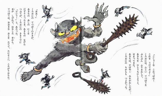 「さるは きいきい ひっかき」みたいなマイルド描写鬼退治がはびこるなか、鬼の金棒が「あしの にくを けずりとった」って鬼気迫る戦いが描かれてる『ぬればやまのちいさなにんじゃ』。このあと主人公の少年は毒針で体の自由を奪われたあげく片足を失うけど、勝つ! やりすぎ