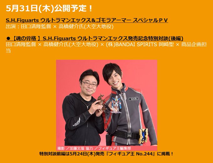 「S.H.Figuarts ウルトラマンエックス&ゴモラアーマーセット」の10月発売決定を記念して、大空大地役・高橋健介氏と、監督・田口清隆氏にご登場いただいた「スペシャルPV」と「特別対談記事」を5月31日公開予定!