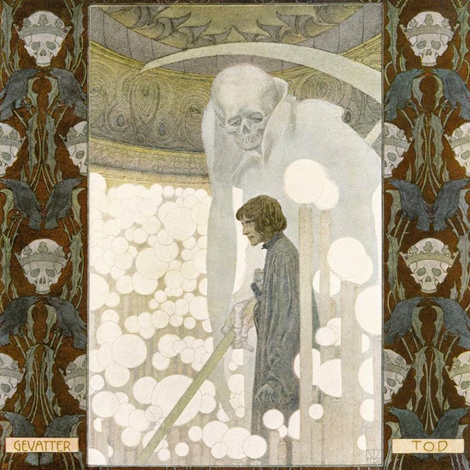 Heinrich Lefler was born #OTD 1863. The first is “Gevatter Tod” (Godfather Death, 1905) #Art #ArtHistory #Death #GrimReaper #ArtNouveau