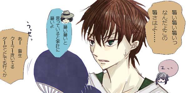 ブログにあげたヒロヤのイラスト。セリフありver。主人公は眠ってます。うちわなのは、冷房かけると電気代が高くなるからですね。ヒロヤのゲーセン通いの理由の一つです。