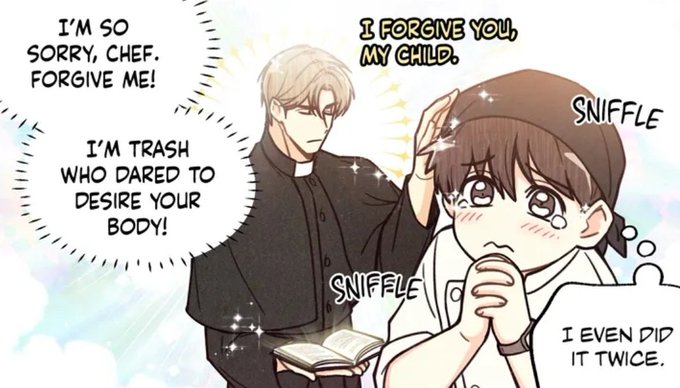 @WritesWee THAT PART omg he literally keeled over while imagining being "punished" that way, wonder what Chef thought seeing him like that 😭😂 He's just so cute and embarrassin!! His thoughts never fail to make me laugh. This one is gold too 😂