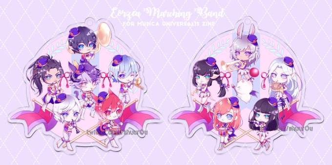 the charms i did for @musicazine!! i wanted to draw msq npcs in a marching band🎶